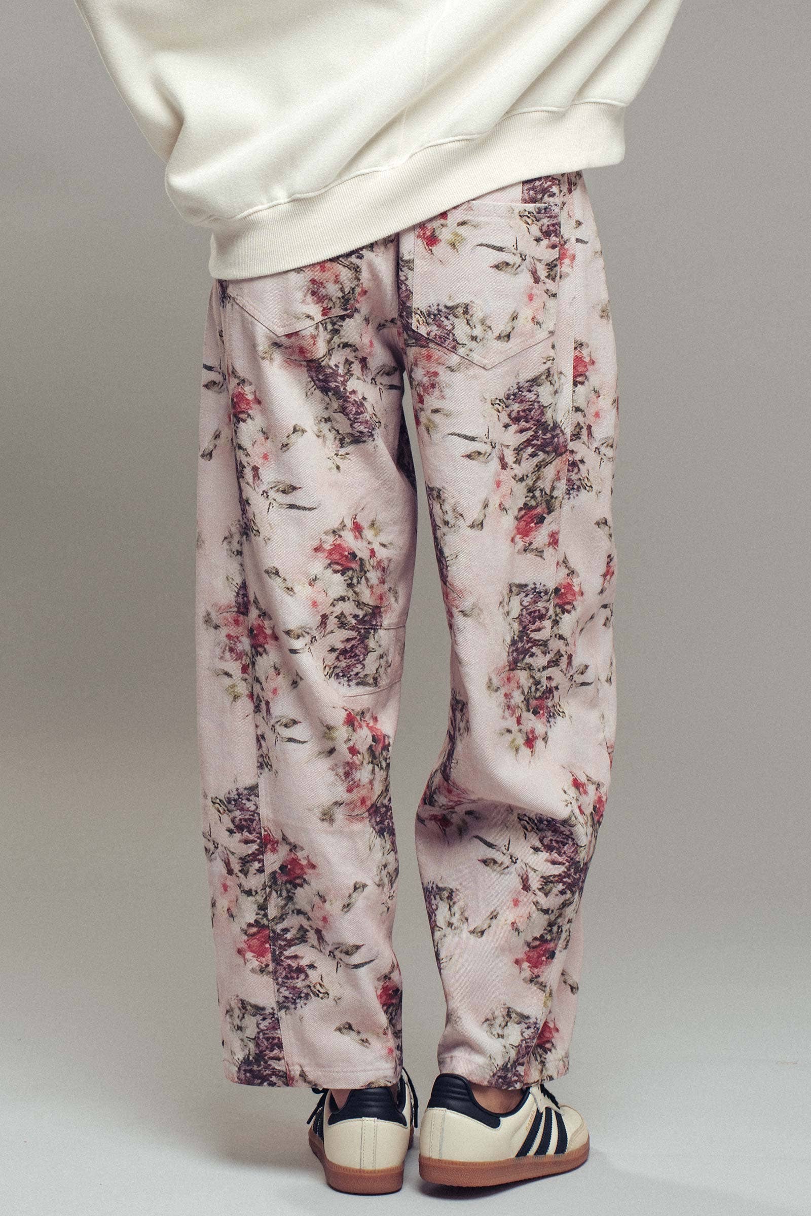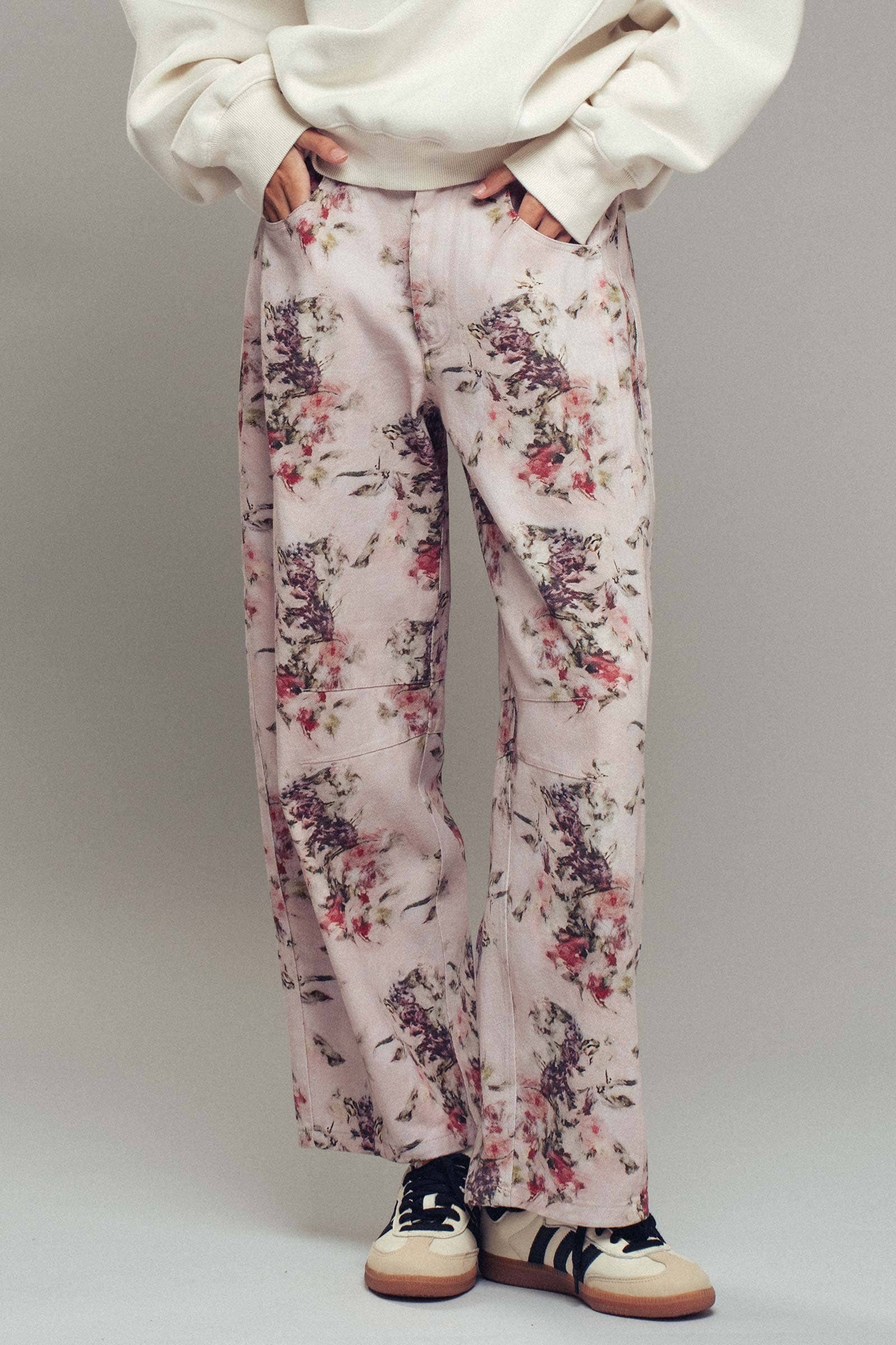 Relaxed denim with an artistic twist, these barrel jeans feature an allover watercolor-inspired floral print in blush, lilac, and crimson. Cut in a modern barrel silhouette with a mid-rise waist, side pockets, and subtle seam detailing for a bold yet wearable look.