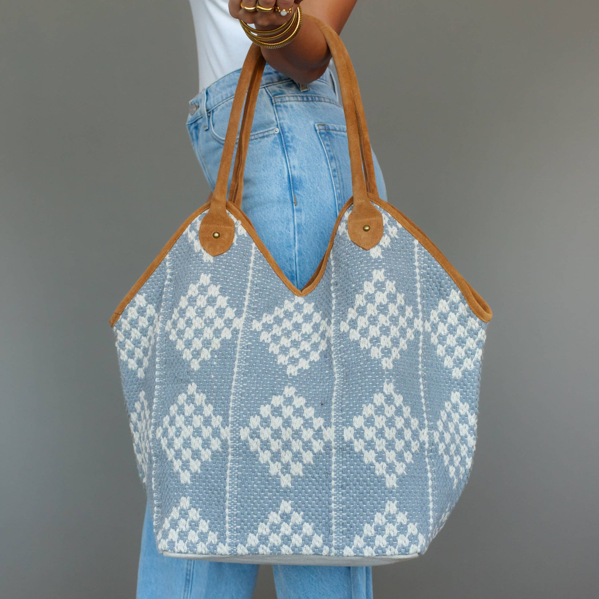 Meet your new go-to tote—the perfect blend of form and free-spirited function. This spacious carryall features a textured diamond pattern woven into soft, durable cotton, finished with rich camel suede straps for that effortless BoHo vibe. Whether you’re heading to the market, the studio, or a weekend getaway, this bag brings laid-back style with room to spare.