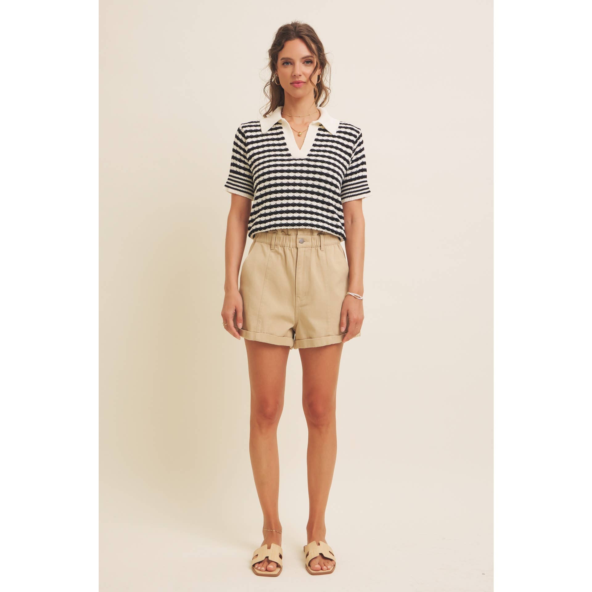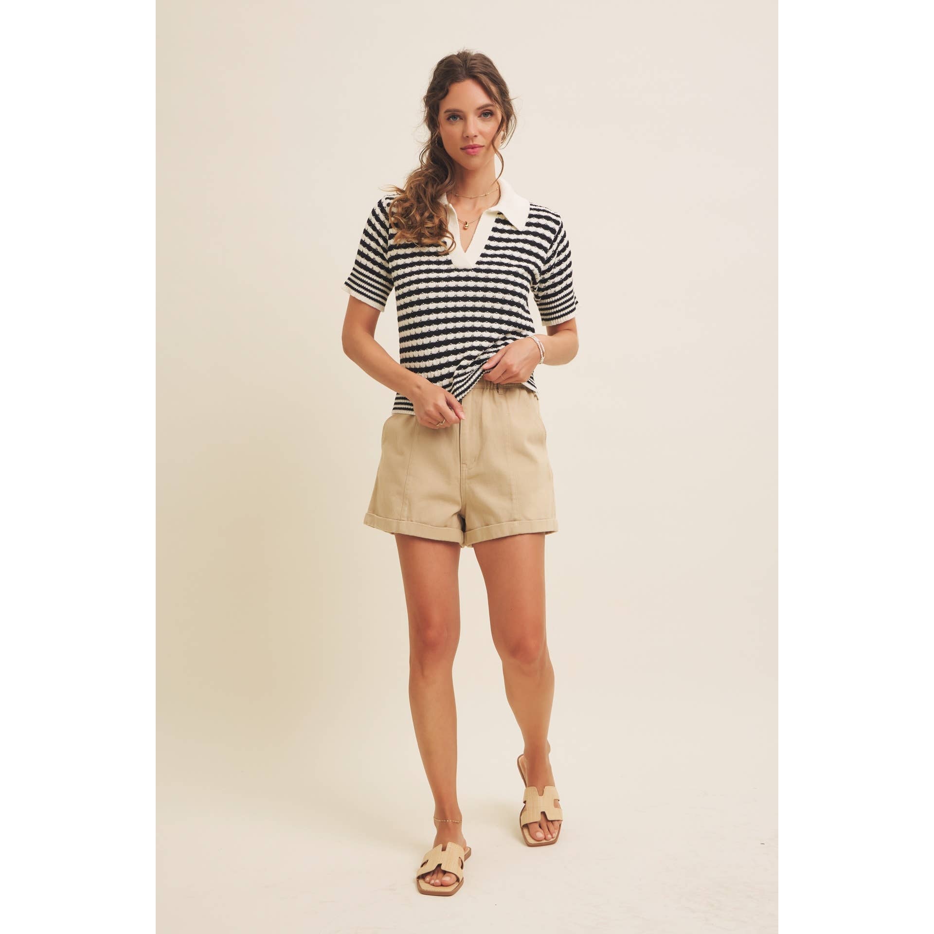 Textured Cotton Split-Neck Short Sleeve Sweater
