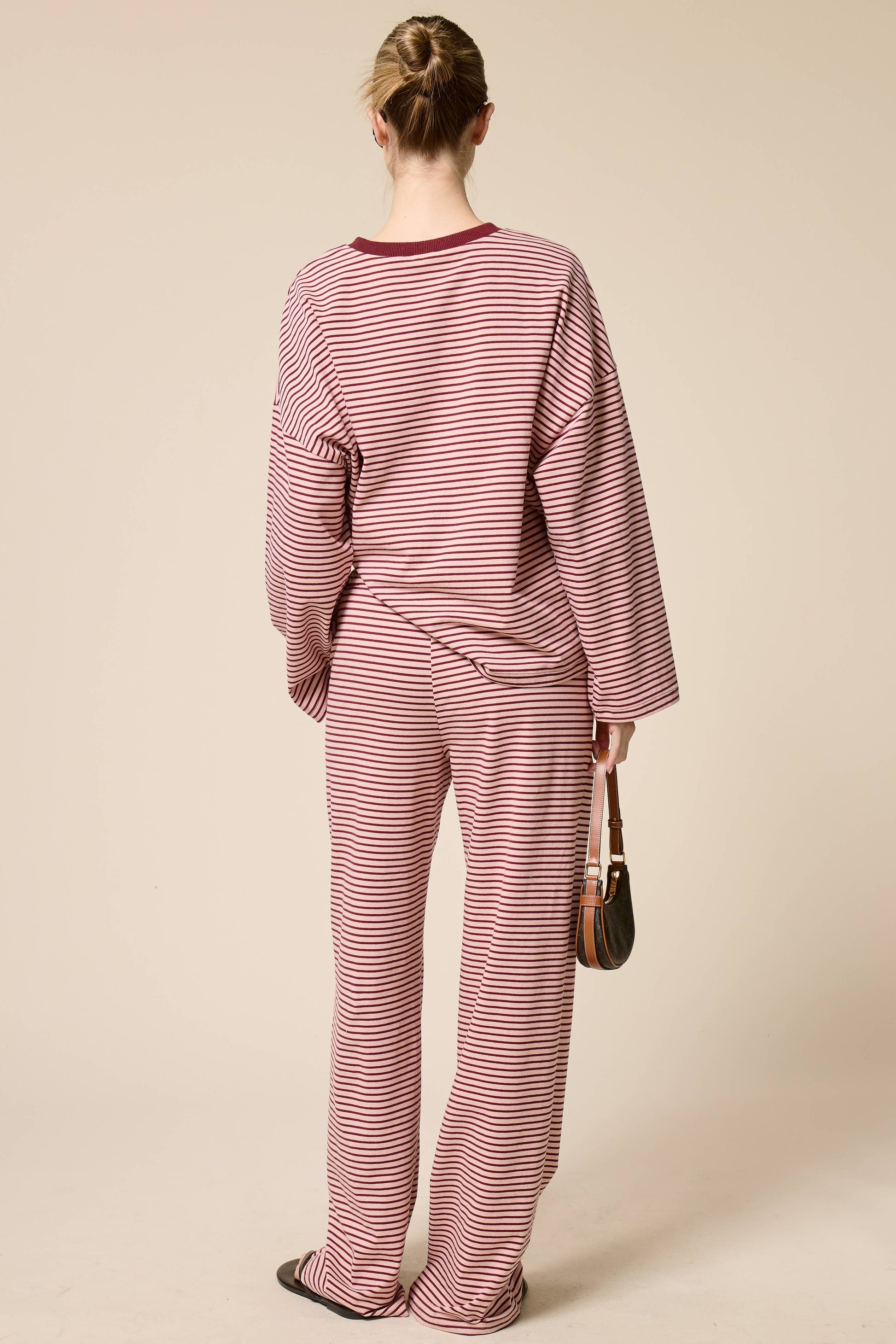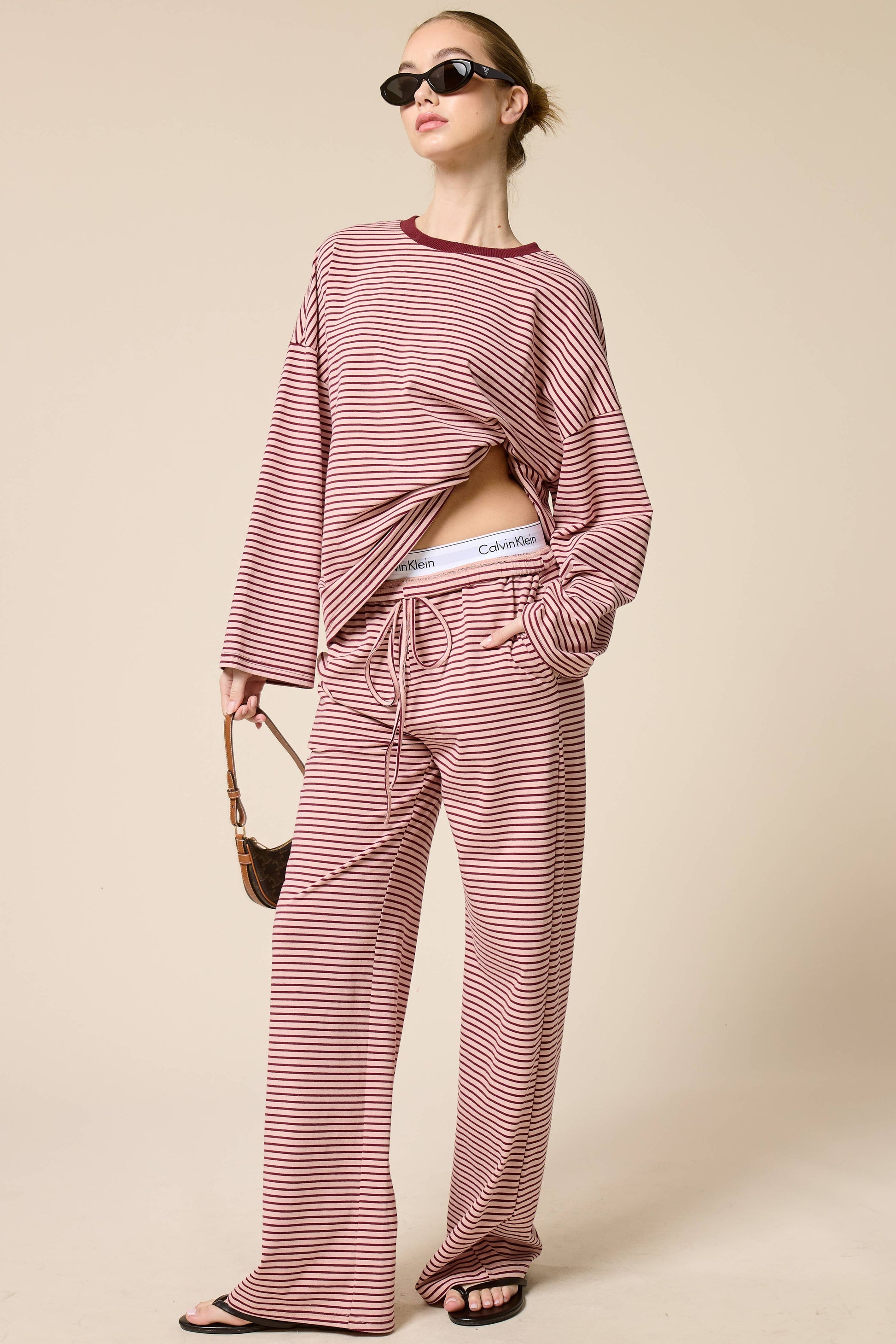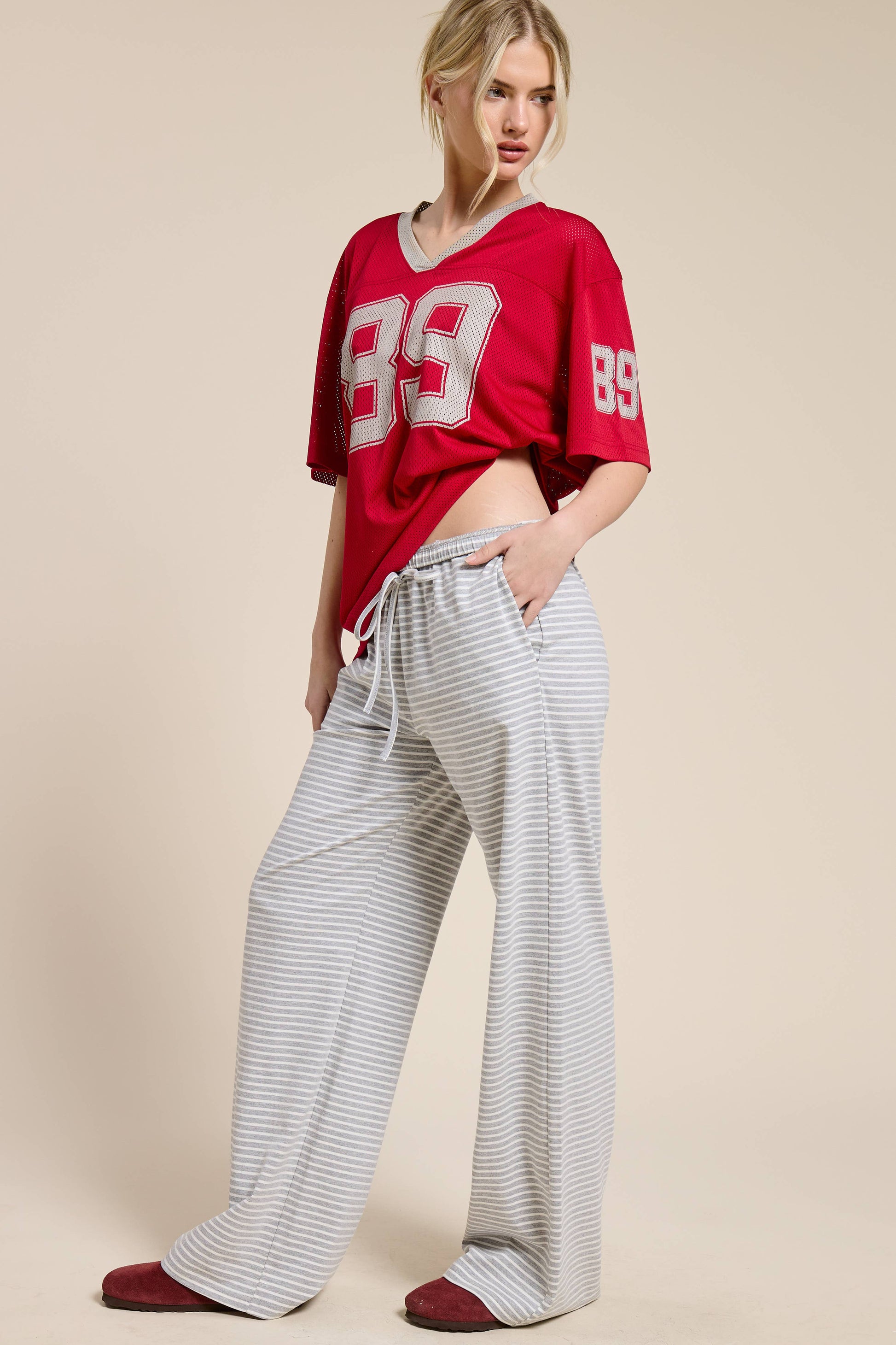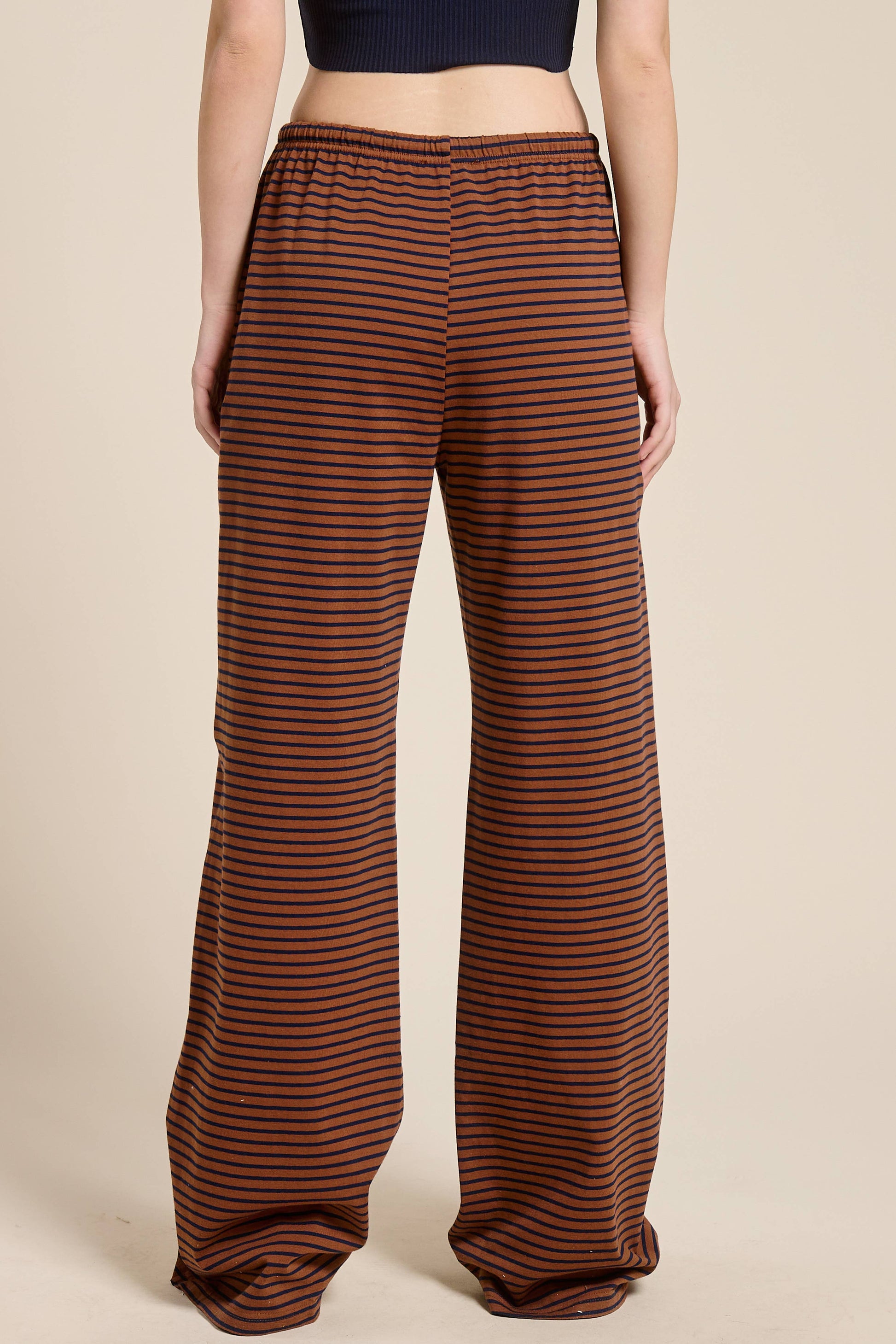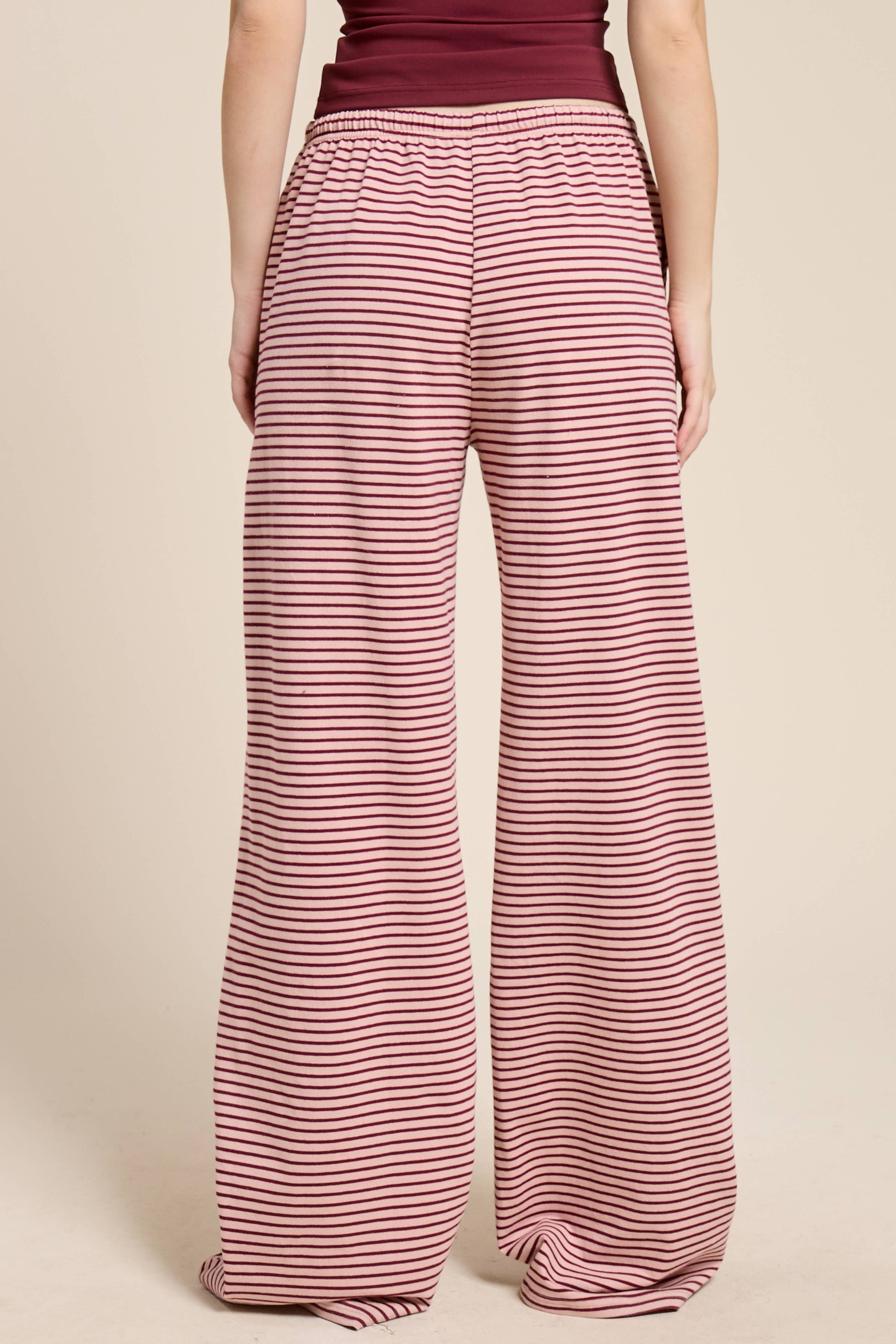 These striped wide leg pants offer a relaxed fit with an easy drape for all-day comfort and everyday wear. • Soft knit fabric • Allover stripe pattern • Elastic waistband • Adjustable drawstring tie • Side pockets • Wide leg silhouette • Relaxed fit • Pull-on style.